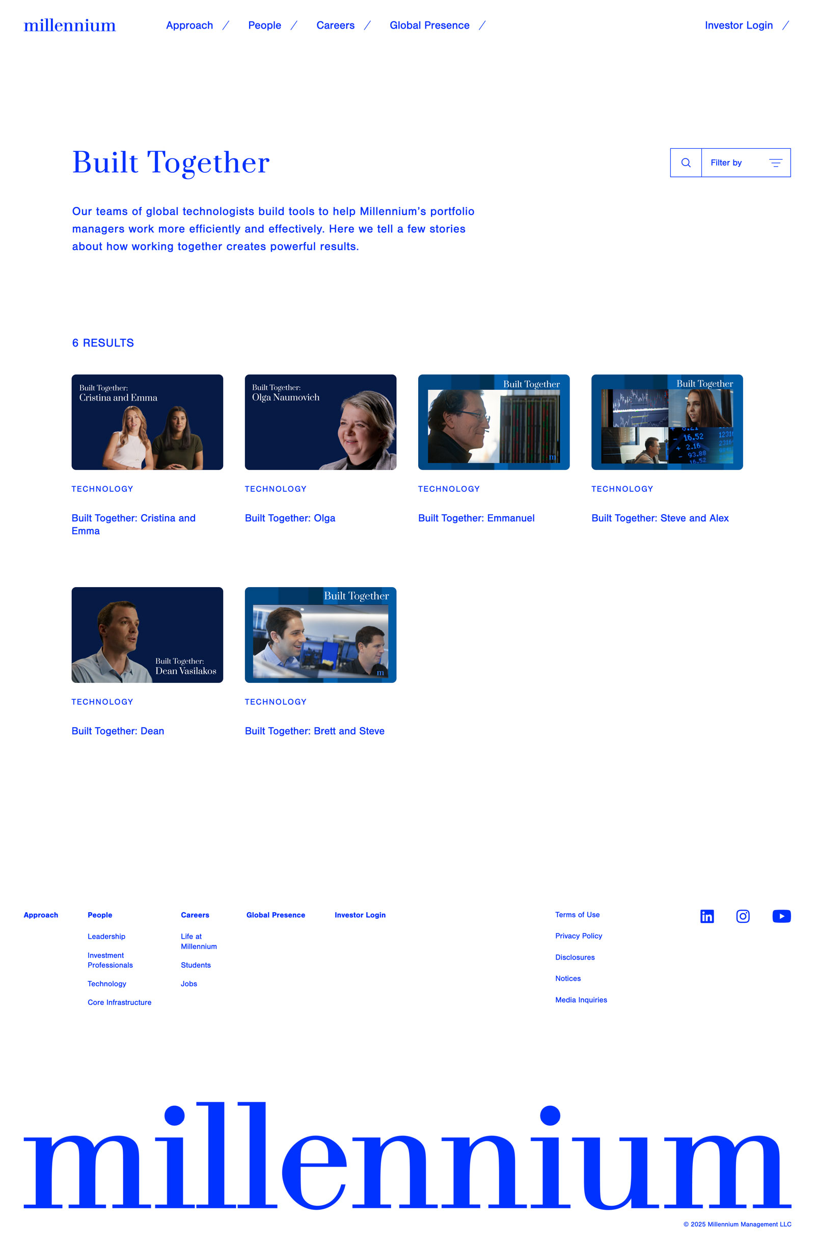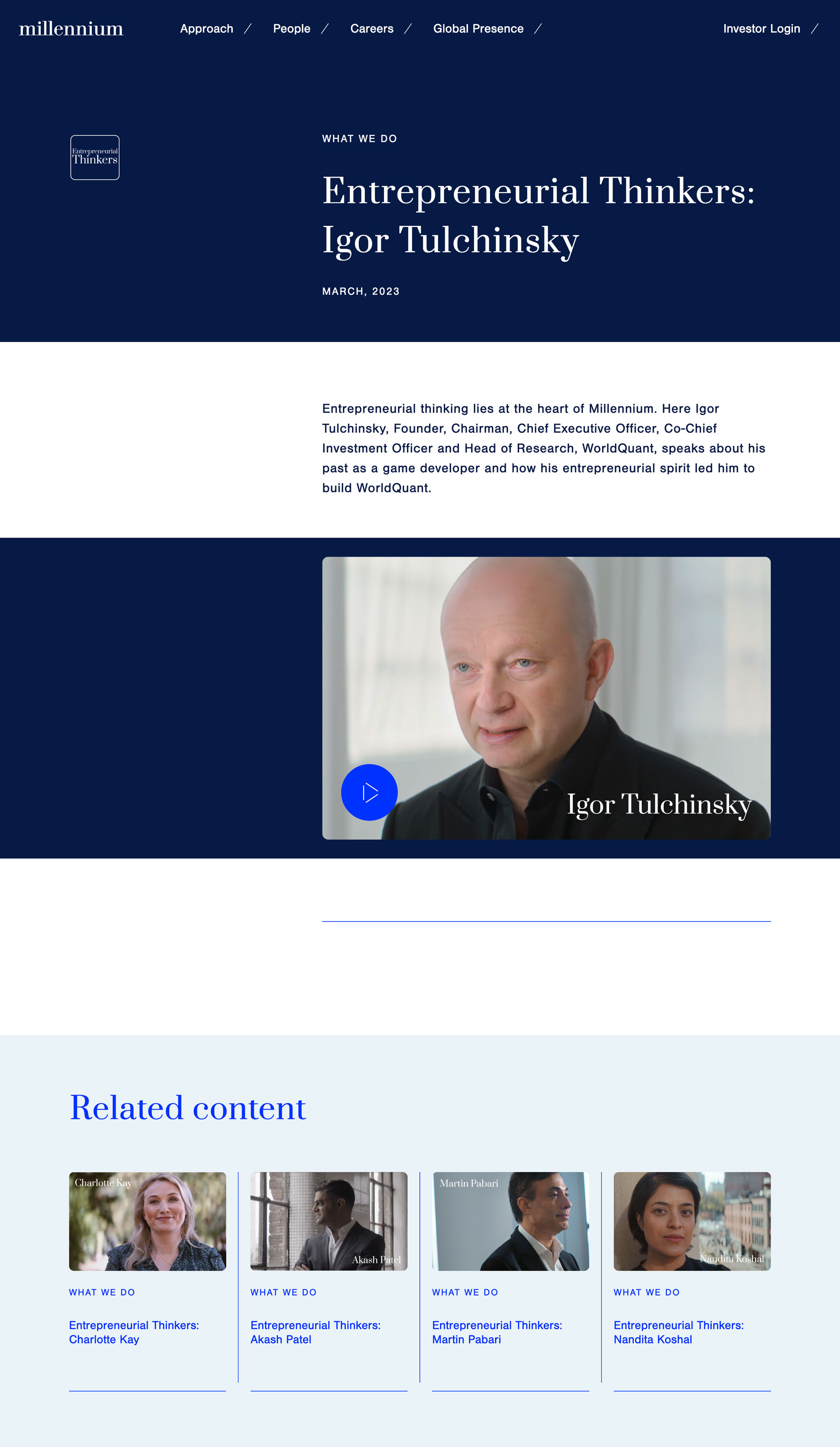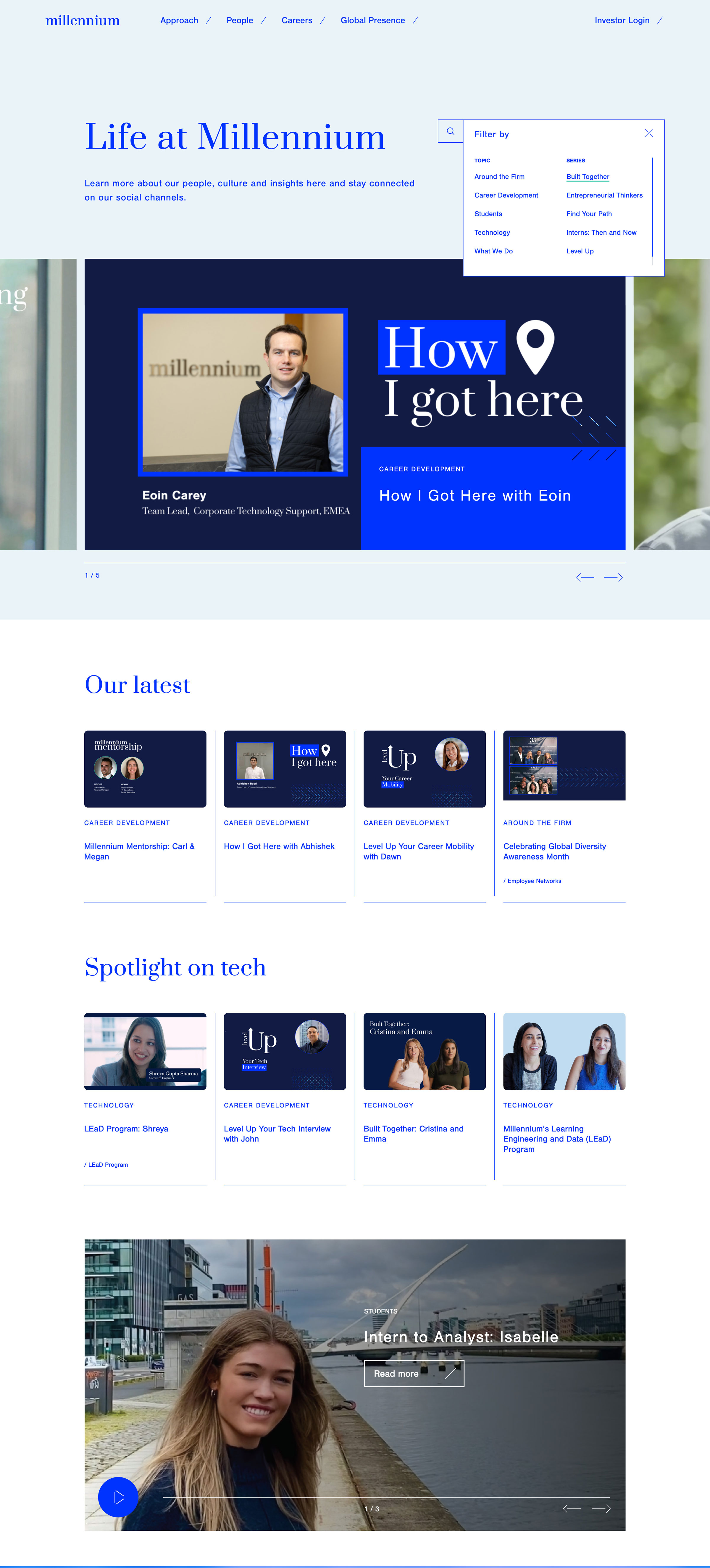 Millennium’s public-facing website was designed to reflect the firm’s institutional presence and global scale. It showcases the firm’s values, leadership, and career opportunities through a polished, minimalist design aligned with the financial industry. The site also features editorial content that highlights Millennium’s people, culture, and insights, along with unique interactive components that encourage user engagement and exploration.
