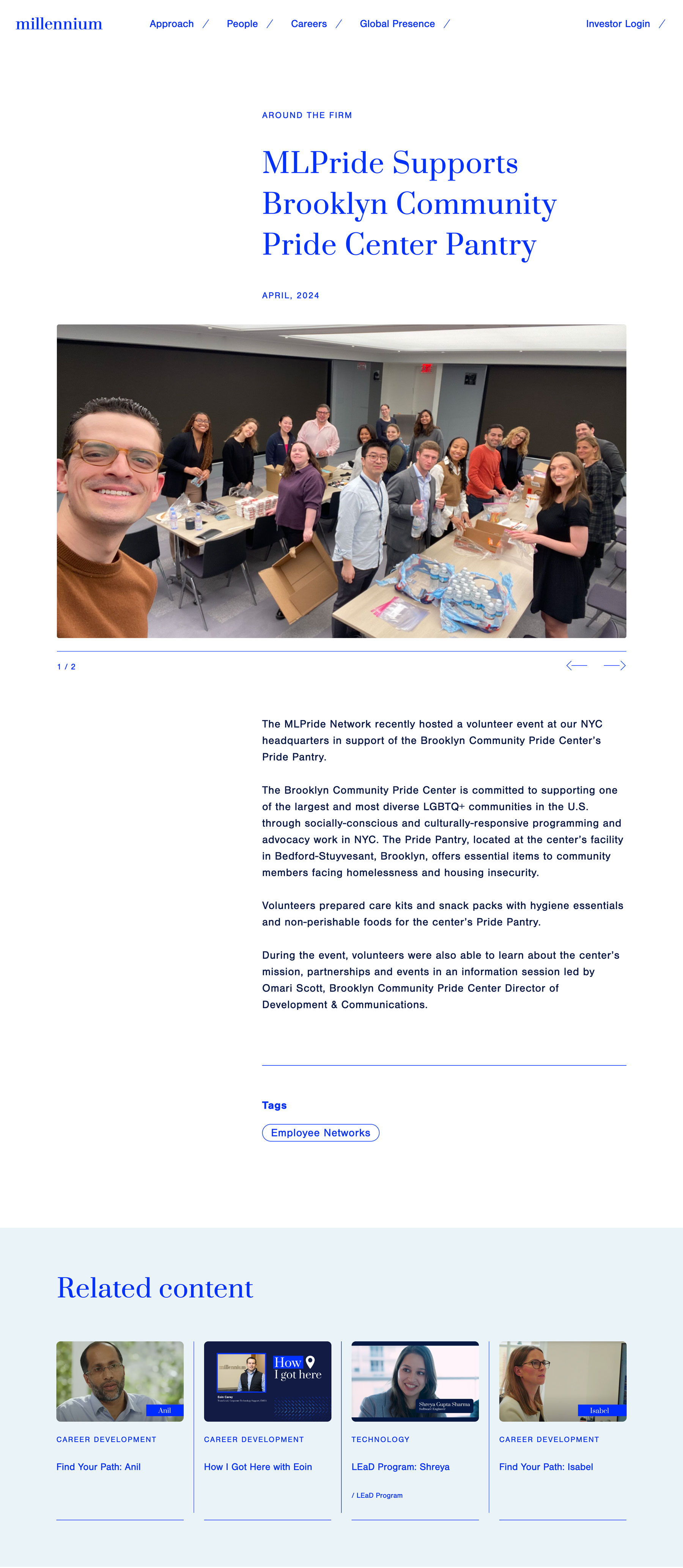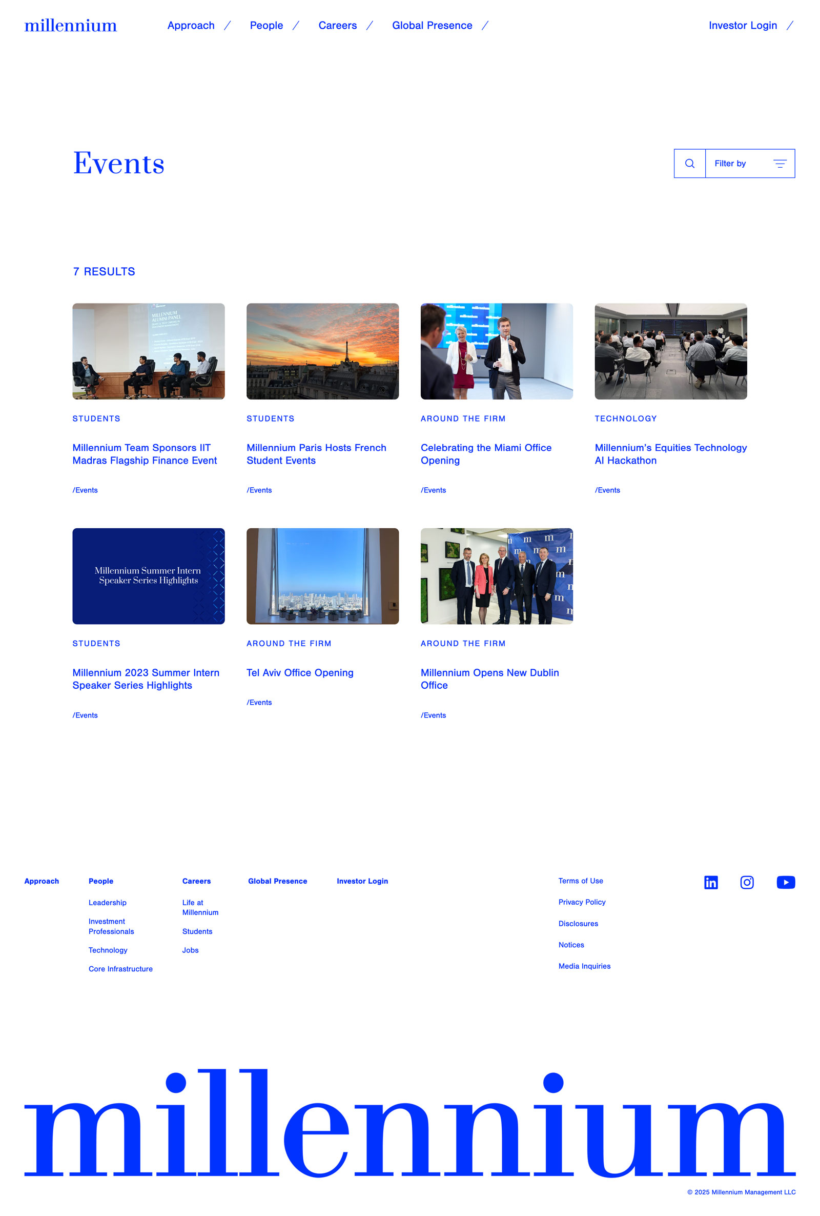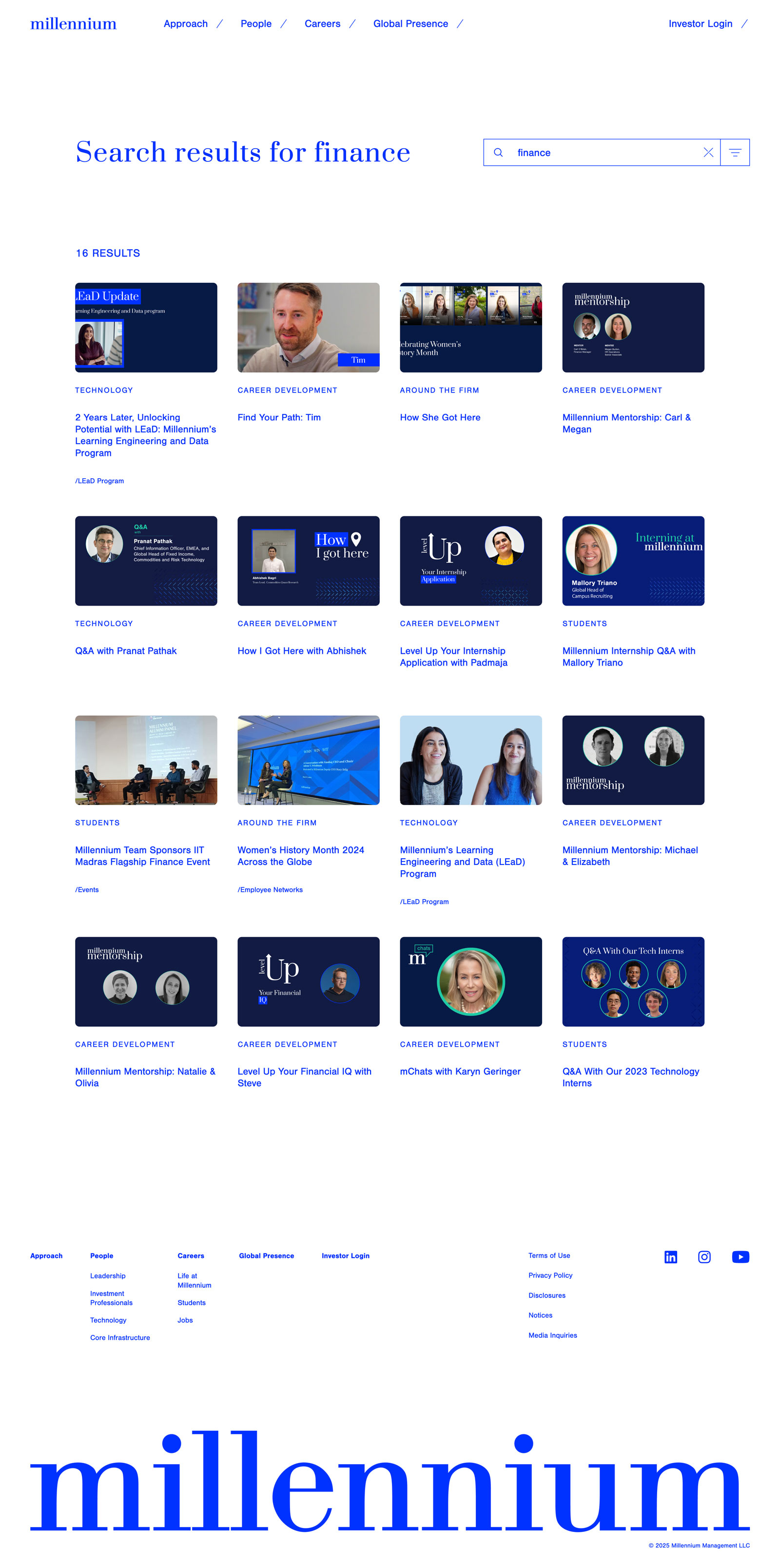 Millennium’s public-facing website was designed to reflect the firm’s institutional presence and global scale. It showcases the firm’s values, leadership, and career opportunities through a polished, minimalist design aligned with the financial industry. The site also features editorial content that highlights Millennium’s people, culture, and insights, along with unique interactive components that encourage user engagement and exploration.