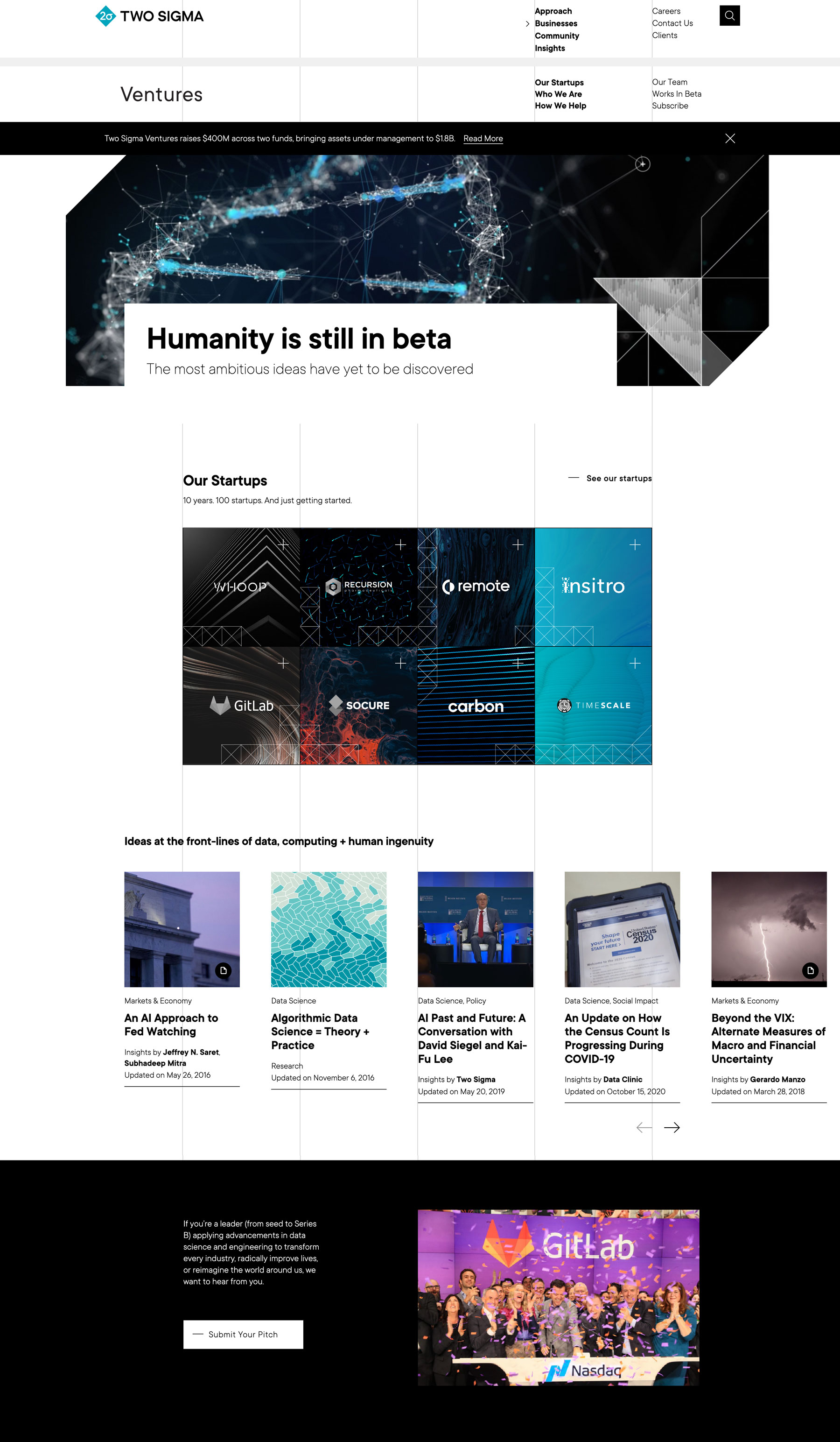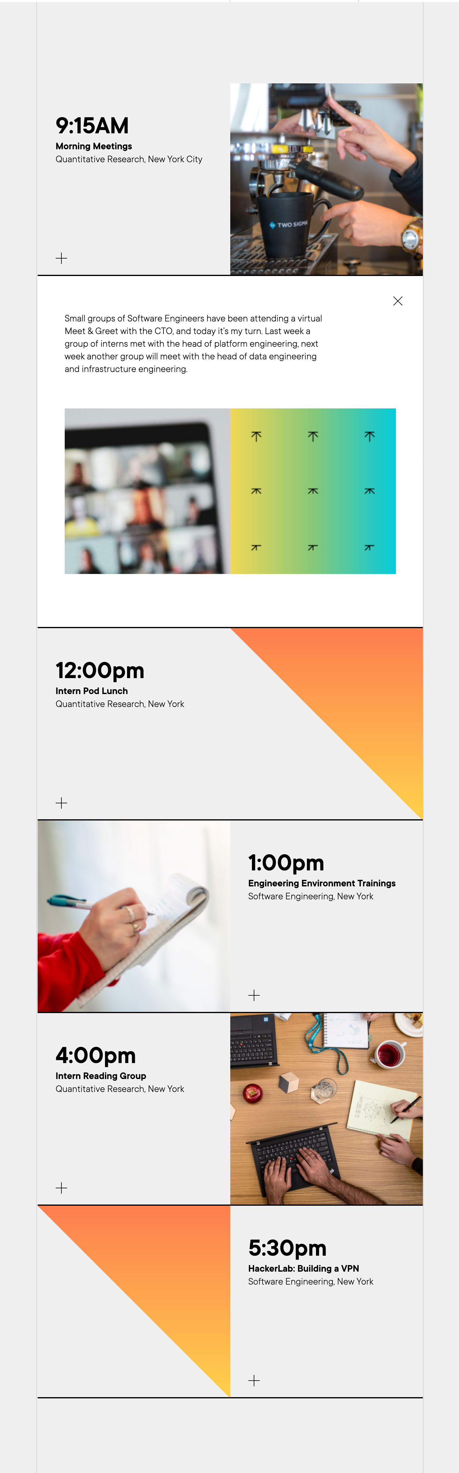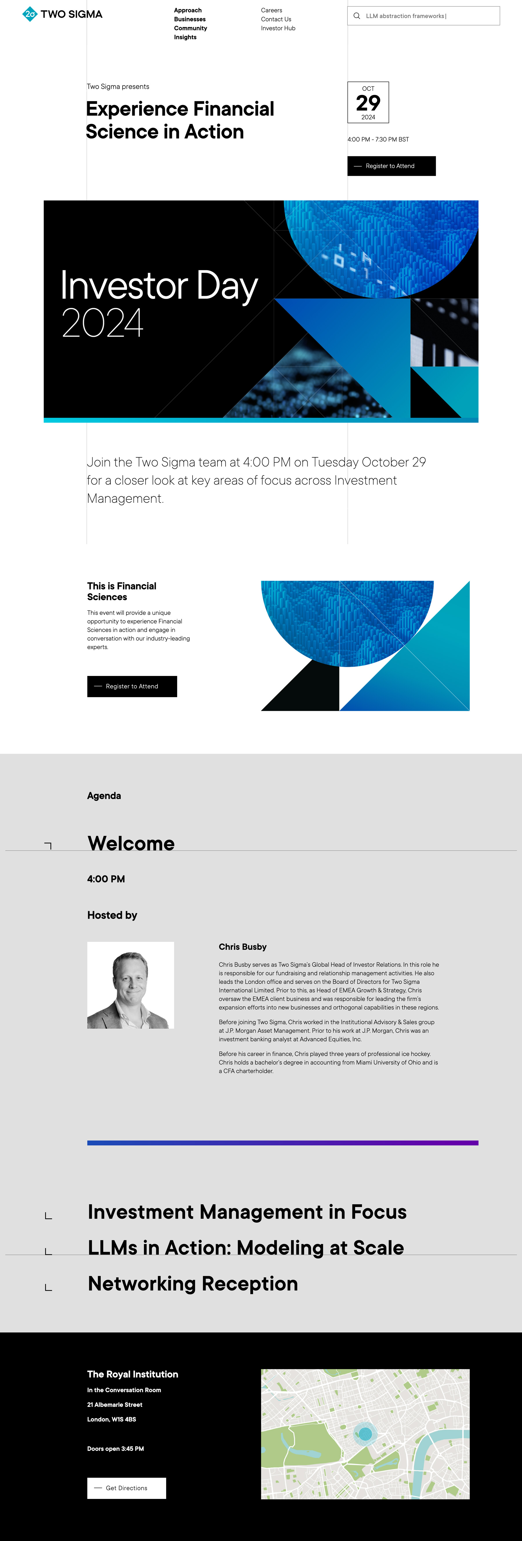 Two Sigma is a New York-based hedge fund company known for its strong focus on financial sciences. Applying scientific and engineering principles to finance, they operate at the intersection of data, technology, and innovation. Given their analytical rigor, our team aimed to bring their story to life through creative and engaging storytelling across digital components.