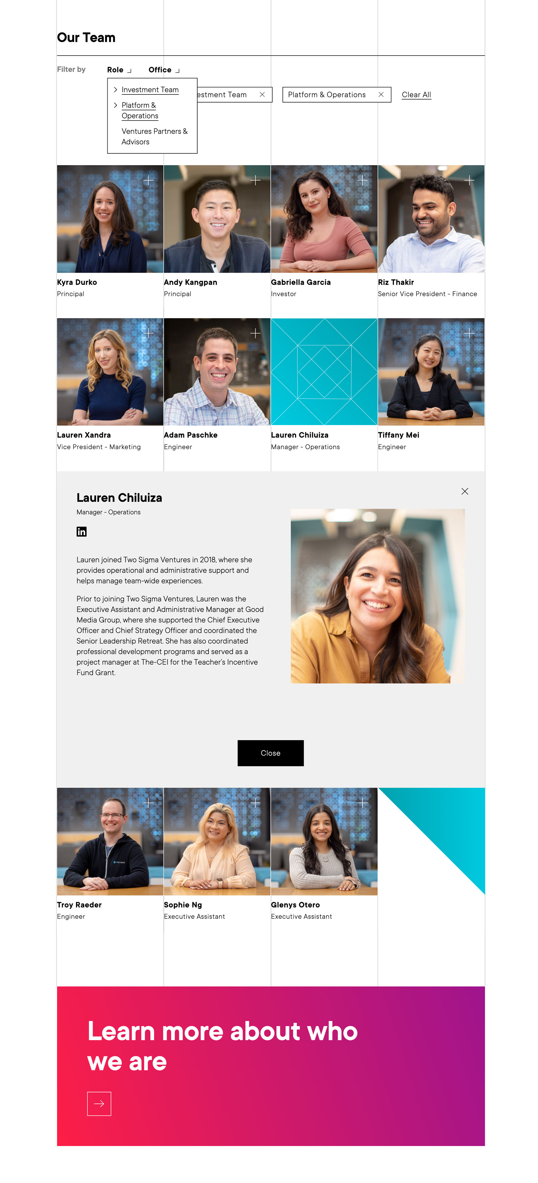 To support Two Sigma’s diverse business lines—such as Sightway Capital, Real Estate, and Ventures—we developed flexible entity templates that maintain a cohesive brand while offering subtle visual distinctions from the main site. Each entity template includes its own article archive, team page, and customizable layouts. The system is structured to dynamically pull and display data specific to each entity, including team members, articles, and search results.