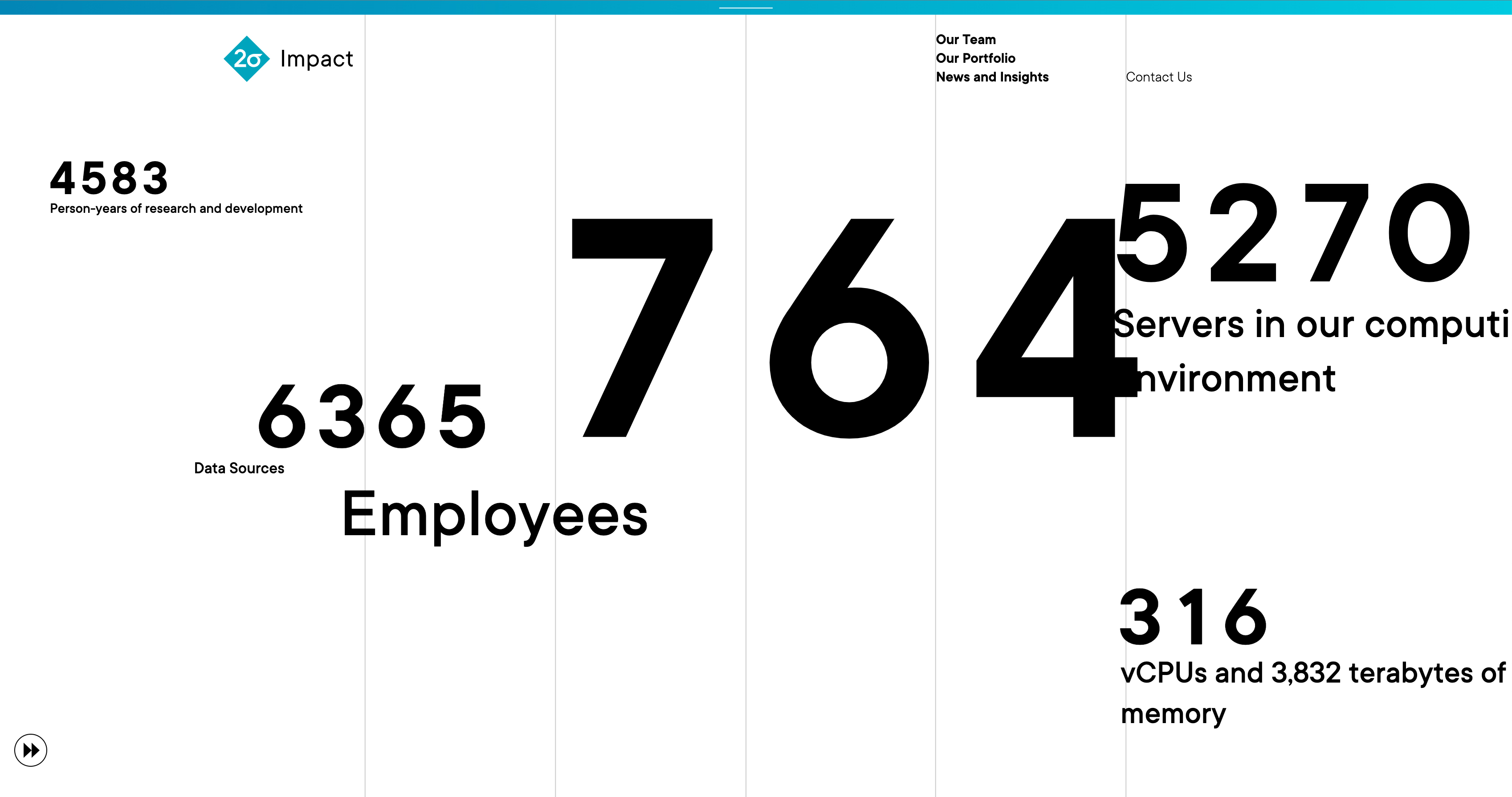 As users scroll, key metrics—such as number of employees, data sources, and servers—animate with a count-up effect. This dynamic interaction highlights Two Sigma’s scale and capabilities while boosting user engagement through visual storytelling.