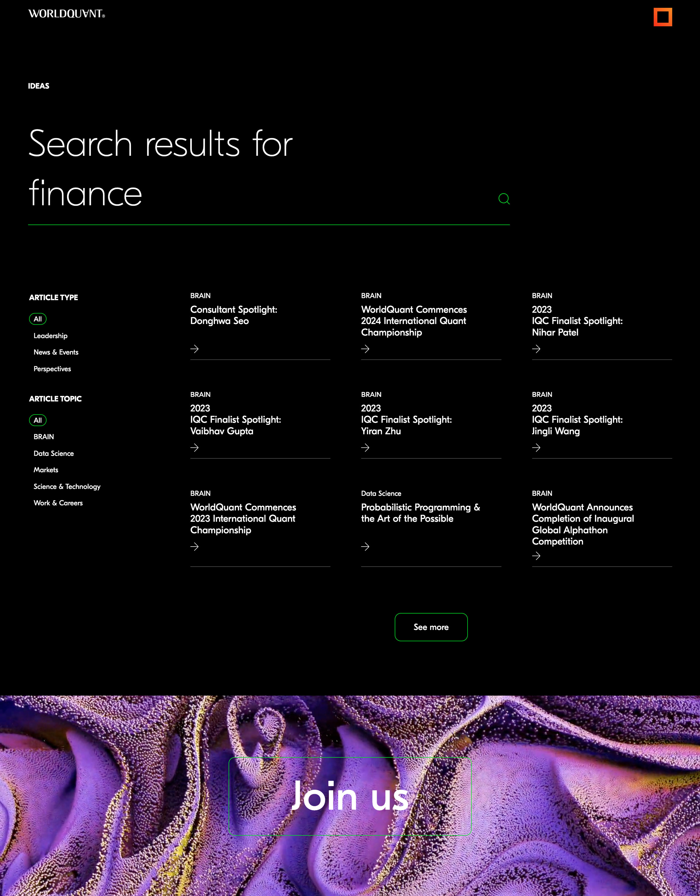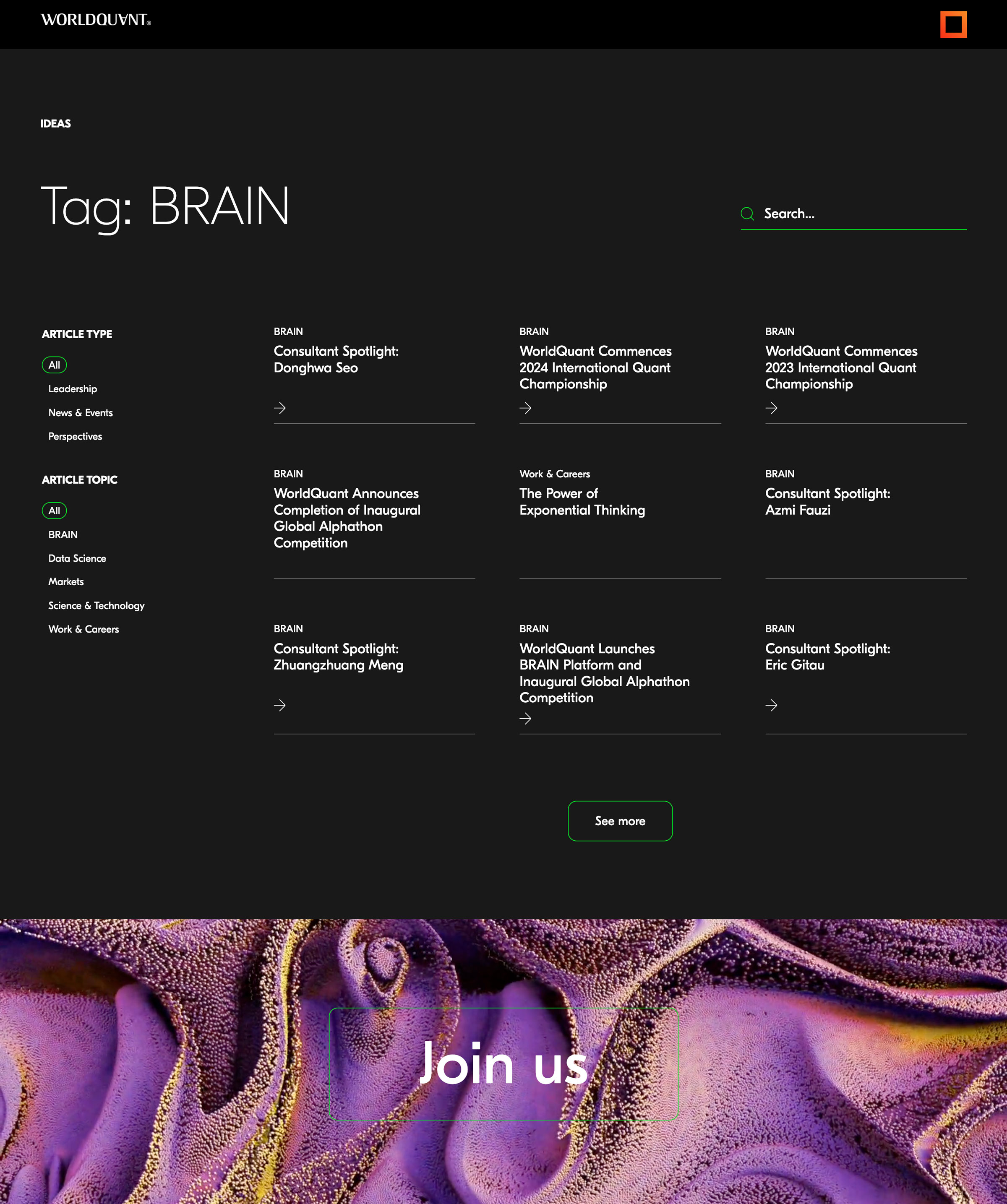 These dynamic views allow users to explore WorldQuant’s editorial content through search results and tag-specific filtering. Whether users are searching by keyword or browsing by topic tags like BRAIN or Data Science, results are presented in a clean, consistent layout that supports filtering by article type and topic.